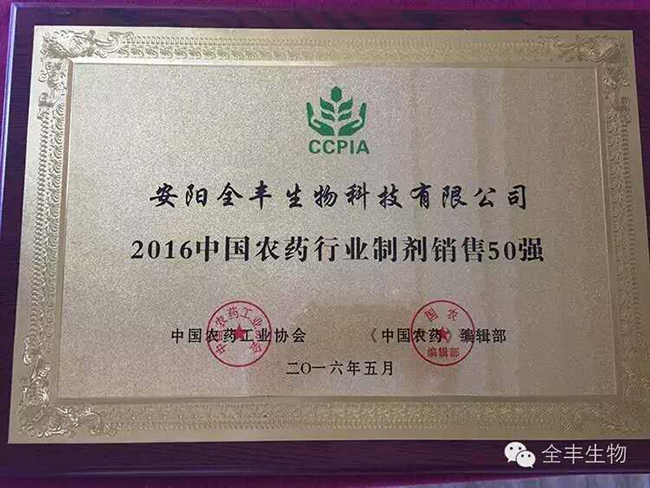 安陽全豐生物科技有限公司以“誠潤田園、豐達(dá)天下”為崇高使命,“全心服務(wù)、豐收萬家”為不懈追求。始終堅(jiān)持質(zhì)量第一、服務(wù)第一的理念,榮獲中國制劑銷售50強(qiáng)企業(yè),榜單排名第三十七位!