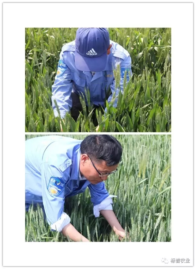 藥劑督察組的第一站來到作業(yè)點隆化村,組員們頂著烈日進入田地調查病害,首先通過全豐無人機遙感技術對小麥病蟲害進行了遙感定量監(jiān)測,發(fā)現(xiàn)這里是蚜蟲病害發(fā)生初期,還有條銹病和赤霉病。