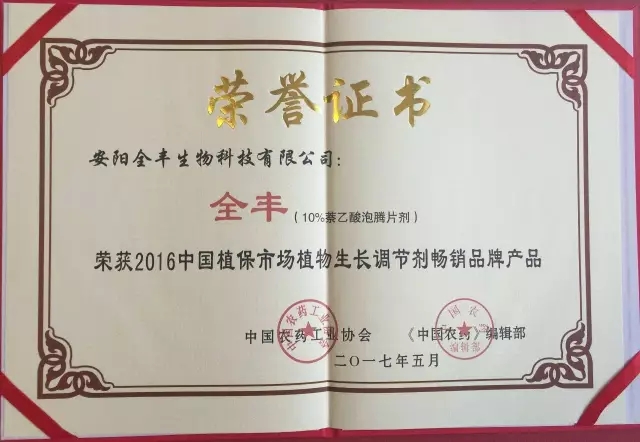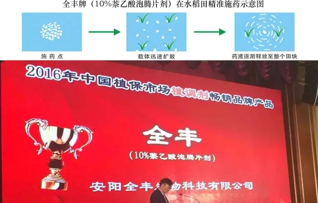 同時(shí),全豐牌10%萘乙酸泡騰片劑榮獲2016年中國(guó)植保市場(chǎng)植物生長(zhǎng)調(diào)節(jié)劑暢銷(xiāo)品牌產(chǎn)品。日子美(20%赤霉酸可溶粉劑)榮獲2016年中國(guó)植保市場(chǎng)最具市場(chǎng)爆發(fā)力品牌產(chǎn)品。